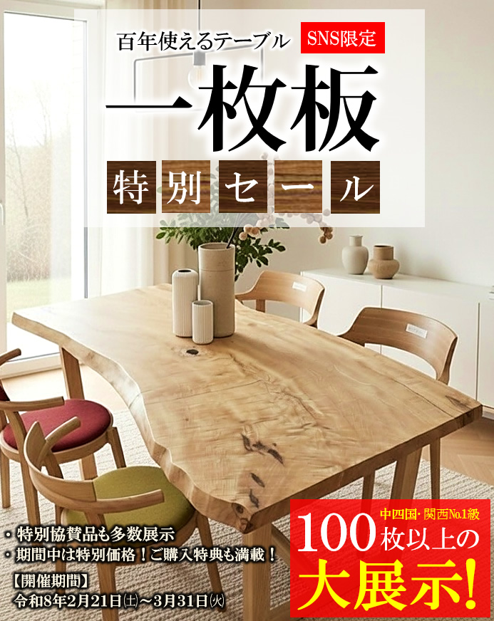 中四国・関西最大規模!一枚板100枚以上大展示!日本有数の木の産地、九州・四国・岐阜・北海道から最高の銘木が100枚以上大集結!
