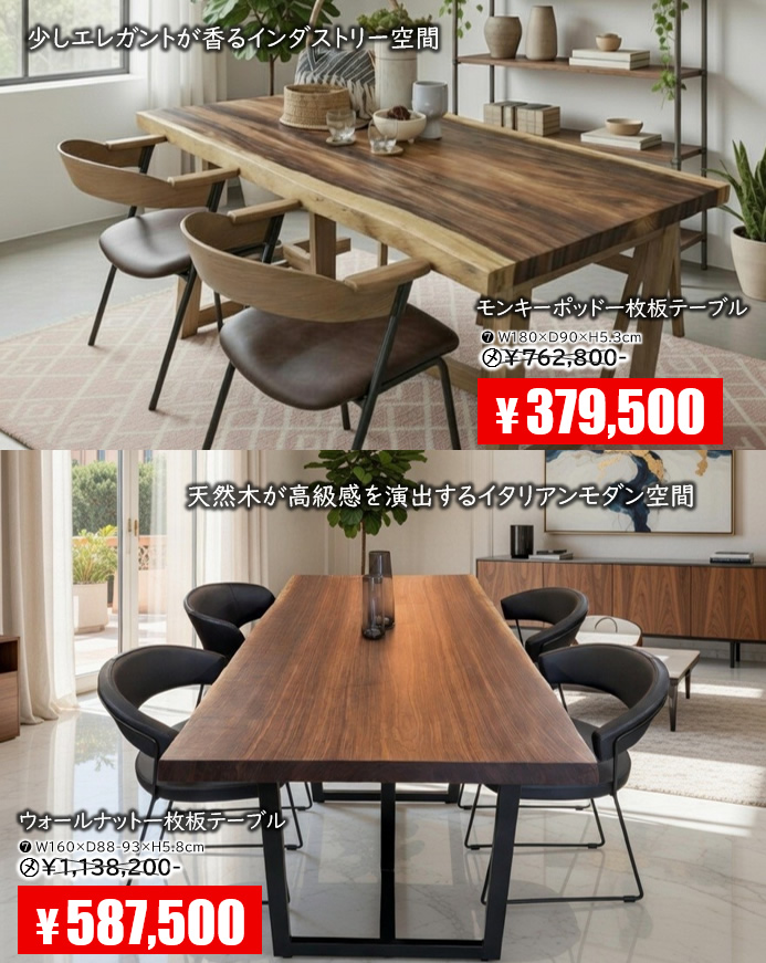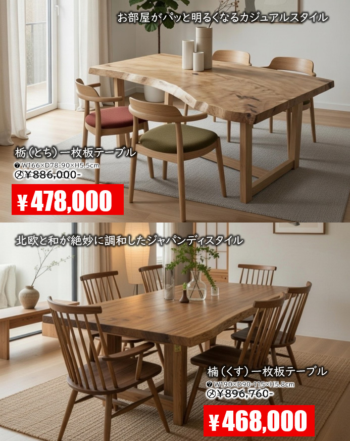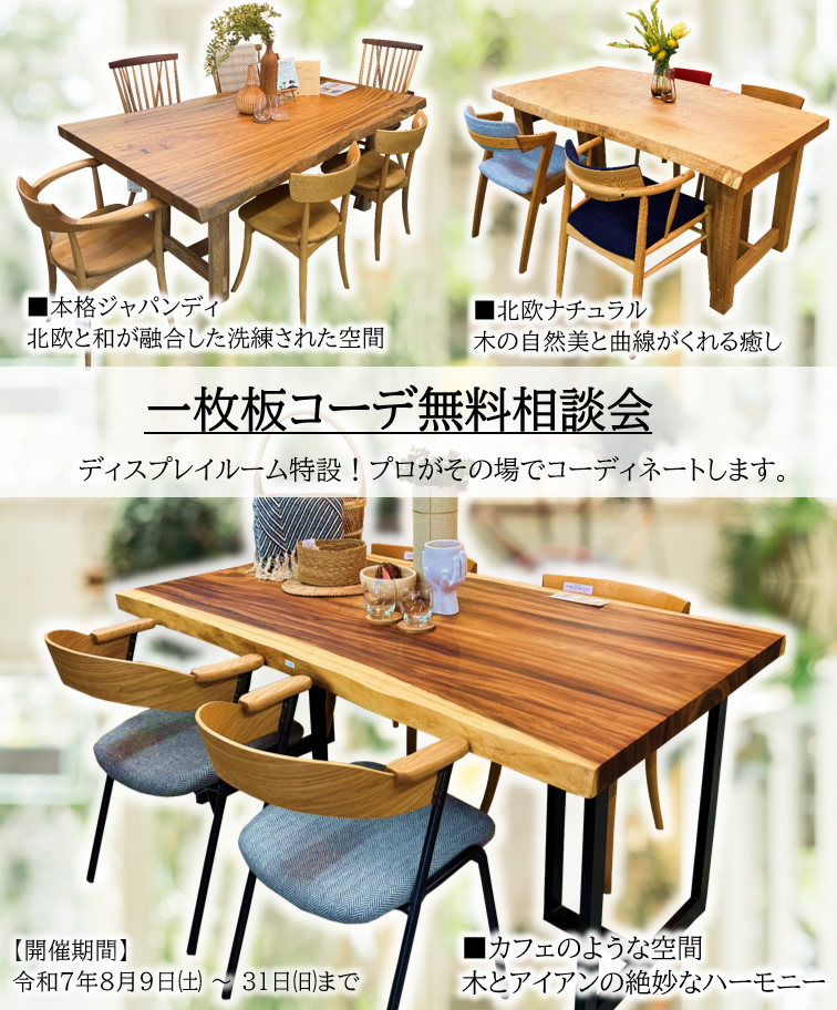 日本№1の出荷量を誇る一枚板メーカー協賛のもと、激安超特価な一枚板コーナーを特設!座卓・リビングテーブルサイズの特価品も多数展示しております!