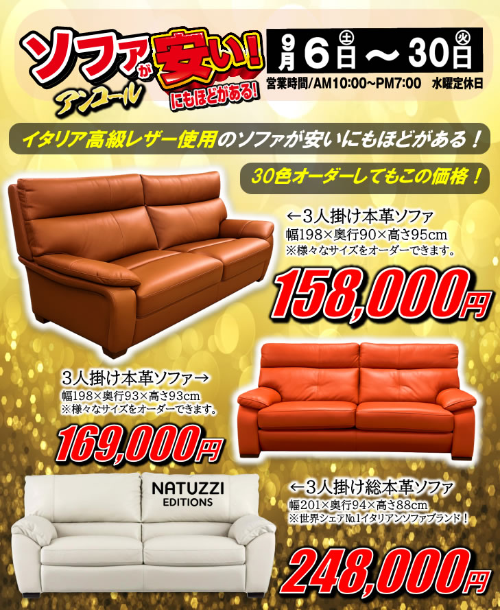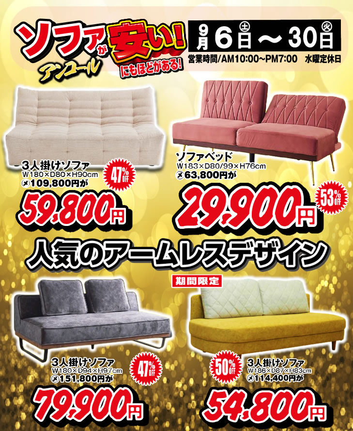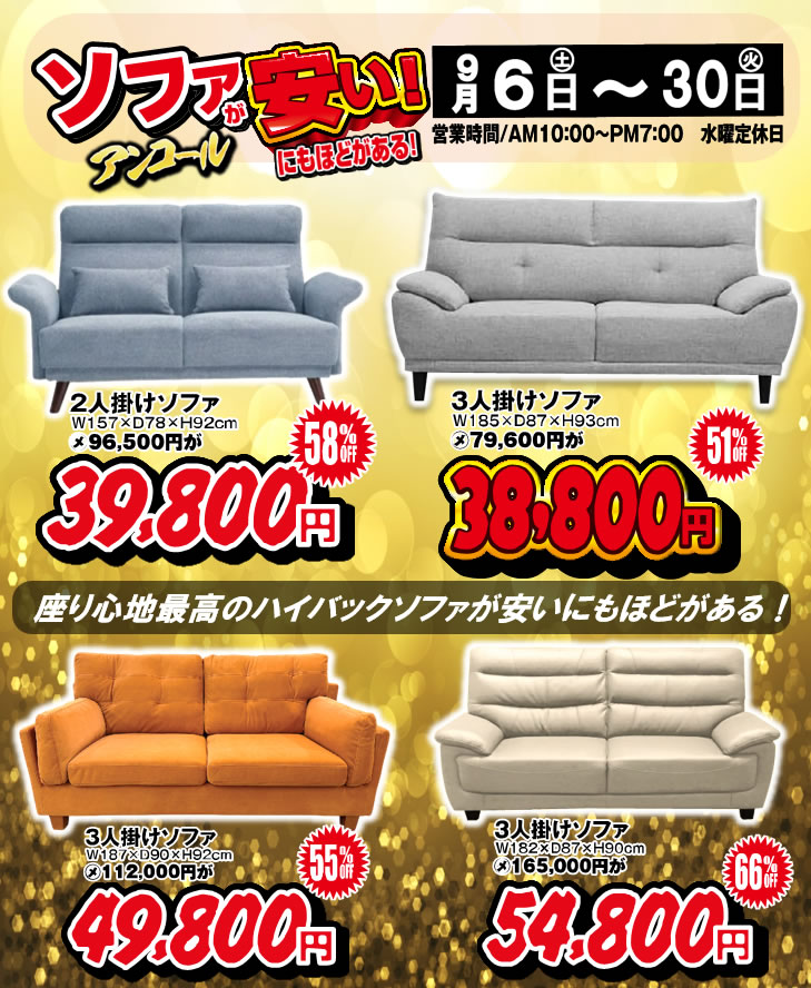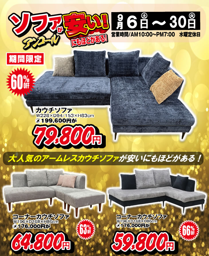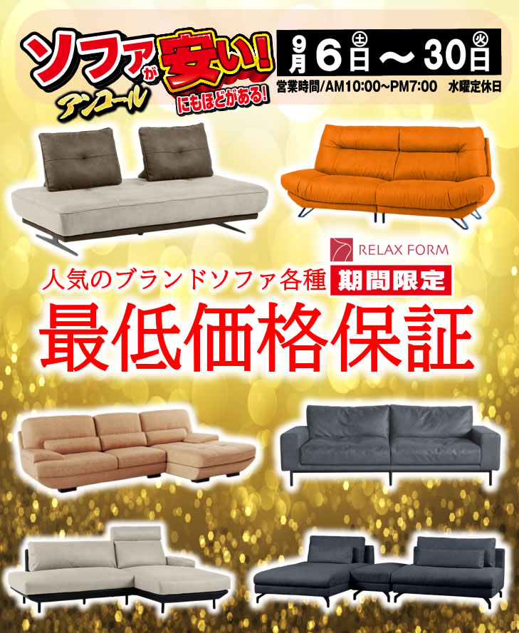 全ソファ限界値下げ敢行!また、期間限定で有名ブランドも最低価格保証!