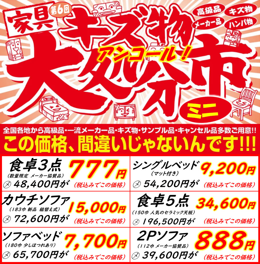 11月3日㈯から11日㈫の期間限定 激安価格で家具大放出 最大90%OFF ブランド家具も最低価格保証