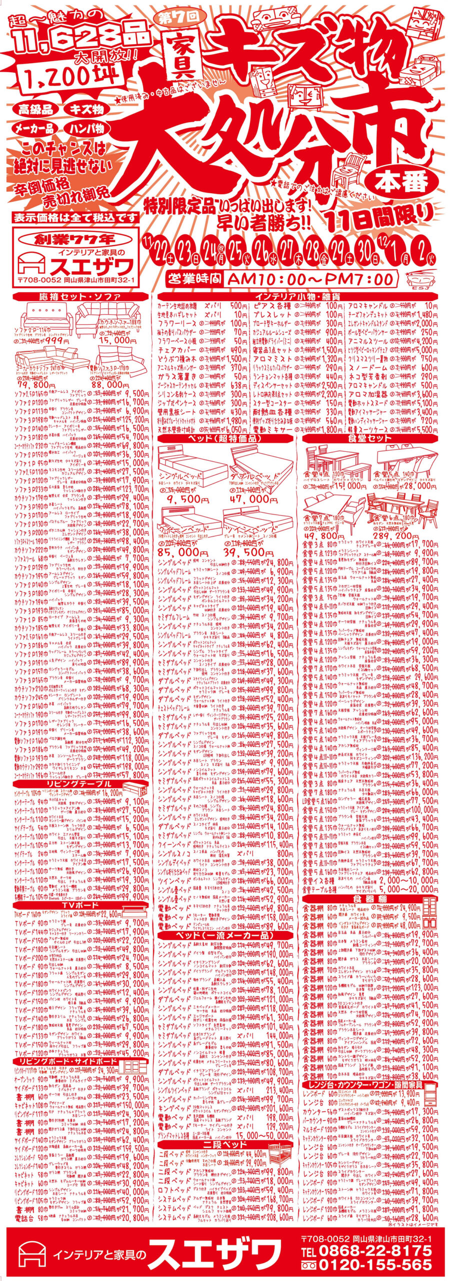 11月22日㈯から12月2日㈫の期間限定 激安価格で家具大放出 最大90%OFF ブランド家具も最低価格保証